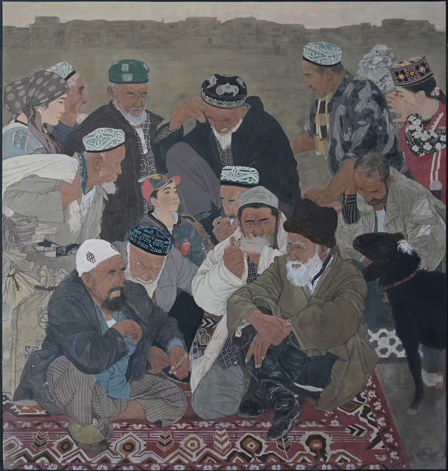 新疆喀什地区在“一带一路”经济带中占有重要战略地位,在新时代推动丝绸之路经济带建设进程中,是促进我国多民族合作协调发展的关键区域。作品《暖阳》立足文旅融合视角,通过作者深入新疆喀什各地采风及素材整理,聚焦于当地生态人文景观与绿色发展,并以此为基础,把其中最具代表性的人物形象汇聚于画面之中,生动展现新疆维吾尔族人民在脱贫攻坚过程中乐观坚毅的精神面目。