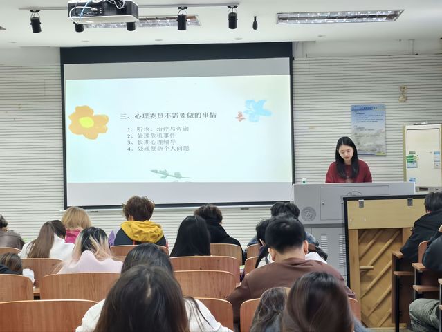 为提升班级心理委员的专业素养与履职能力,明确寝室长职责使命并打造安全有序的住宿环境,美术学院于C102组织开展班级心理委员和寝室长专项培训活动。学院全体心理委员和寝室长共同参与,学院心理辅导员夏薇担任主讲人,以理论讲解结合实操指导的形式,为心理委员和寝室长赋能充电。