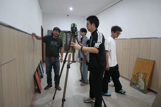 活动现场,江大师生团队分工明确、协作紧密。同学们热情高涨,有的借助专业仪器仔细测量墙面,为作品定位做好准备;有的小心翼翼地搬运画作,生怕在过程中对作品造成一丝损伤;还有的和老师一起进行悬挂调试。从作品的搬运、悬挂到反复调试,每一个步骤都精准细致,凝聚着大家对艺术的敬畏与对活动的用心。