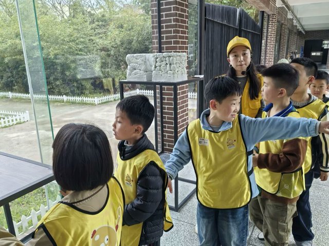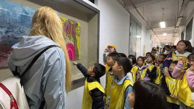 小朋友们在郭诺文同学的讲解下走进小美术馆,展厅中各类艺术作品让孩子们目不暇接。从气势恢宏的山水画作到充满巧思的抽象创作,小朋友不断询问创作背后的故事,惊叹连连。