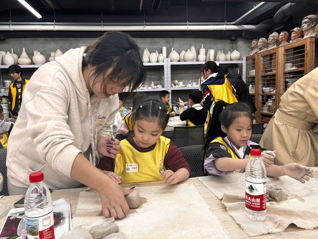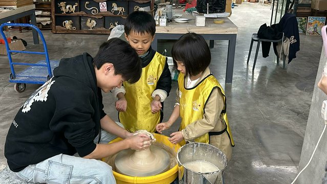 随后,小朋友们就迫不及待地奔向陶艺馆。一踏入馆内,泥土质朴的气息扑面而来,瞬间激发了孩子们的好奇心。专业陶艺老师详细讲解了陶艺的历史渊源、制作方法和技巧,孩子们聚精会神地聆听,眼中闪烁着兴奋的光芒。
