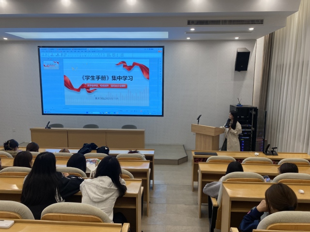 近日,美院于C106报告厅举办“一年级工程”新生入学教育专题会,新生辅导员夏薇主讲、全体新生参与。夏老师围绕大学学习要求与个人发展路径展开讲解,强调自主探索与持续学习能力的培养,并给出具体指引:按时上课、积极互动、提前规划学业进度,同时解读了奖助学金、荣誉评定等政策,提醒新生严守诚信底线、规避违纪风险。她还建议新生通读《学生手册》,并针对专业相关的教师资格证备考等事宜作出提示,助力新生锚定学业目标。