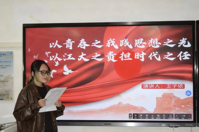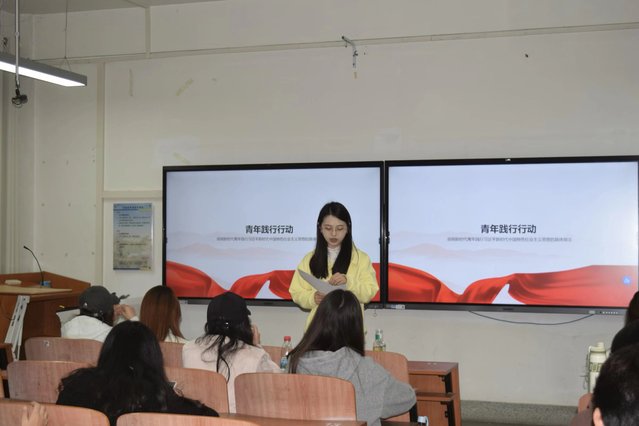 活动在庄重而热烈的氛围中拉开帷幕。各班团支书依次登台,结合精心制作的PPT,呈现了一系列内容丰富、情感真挚的演讲。他们从学校发展实践讲起,生动阐释了江汉大学秉持“创新、协调、绿色、开放、共享”的新发展理念,与武汉城市发展同频共振的奋斗历程,唤起在场师生的强烈共鸣。