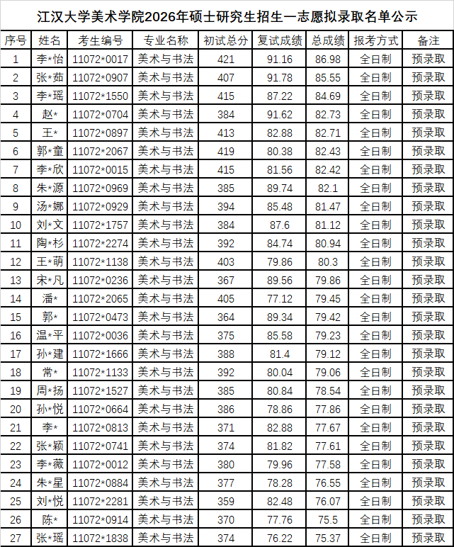 江汉大学美术学院2026年硕士研究生招生一志愿拟录取名单公示